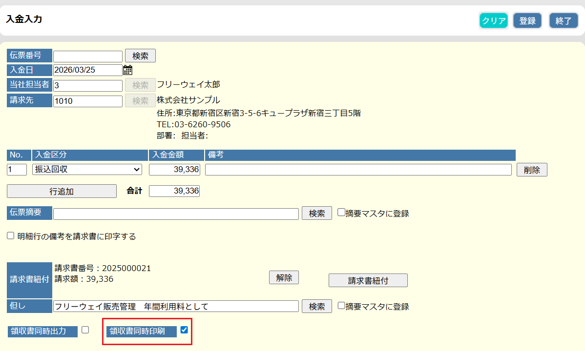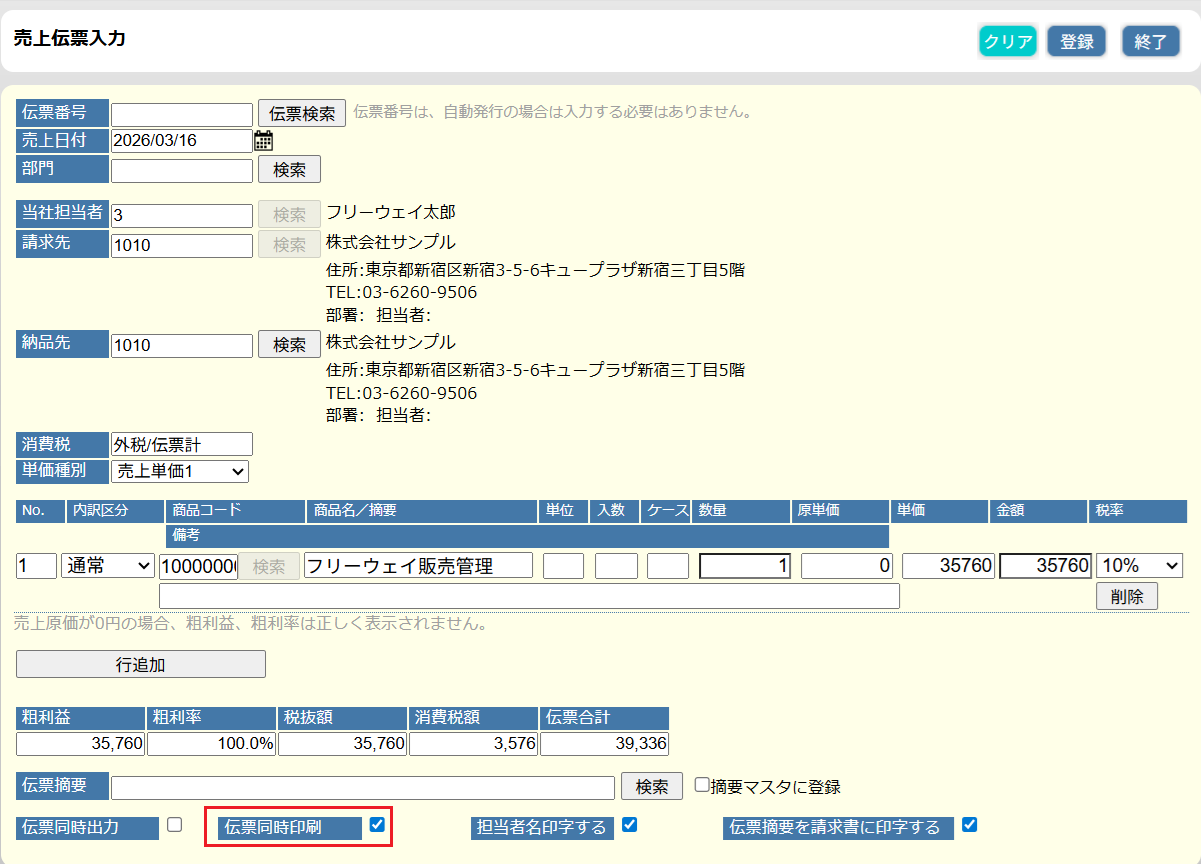 「売上伝票入力」と「入金入力」ページに「同時印刷」チェックボックスを追加しました。チェックを入れて登録すると、登録完了と同時に印刷プレビューが別タブで表示されるため、入力作業が終わった後に印刷ボタンを押す手間を削減できます。